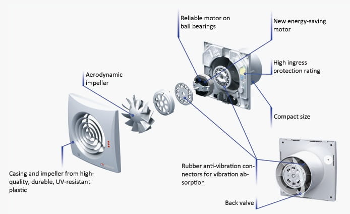- Wentylator został wyposażony w specjalnie zaprojektowany zawór zwrotny zapobiegający cofaniu się powietrza do wnętrza pomieszczenia.