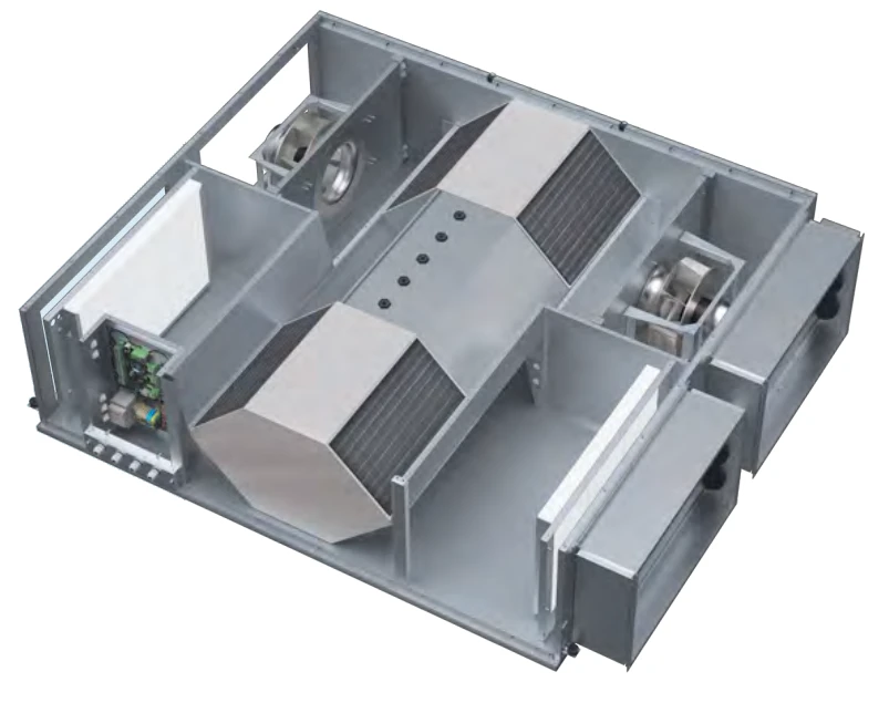 Centrala wentylacyjna z odzyskiem ciepła to nowoczesne urządzenie wentylacyjne zapewniające mechaniczną wymianę powietrza w pomieszczeniach z jednoczesnym jego filtrowaniem. Konstrukcja wymiennika płytowego umożliwia pozyskanie energii cieplnej z powietrza wywiewnego do ogrzania powietrza nawiewanego z zewnątrz. Centrale są przeznaczone do energooszczędnej wentylacji obiektów oraz montażu z przewodami wentylacyjnym o przekroju: 600x350, 800x500 mm.
