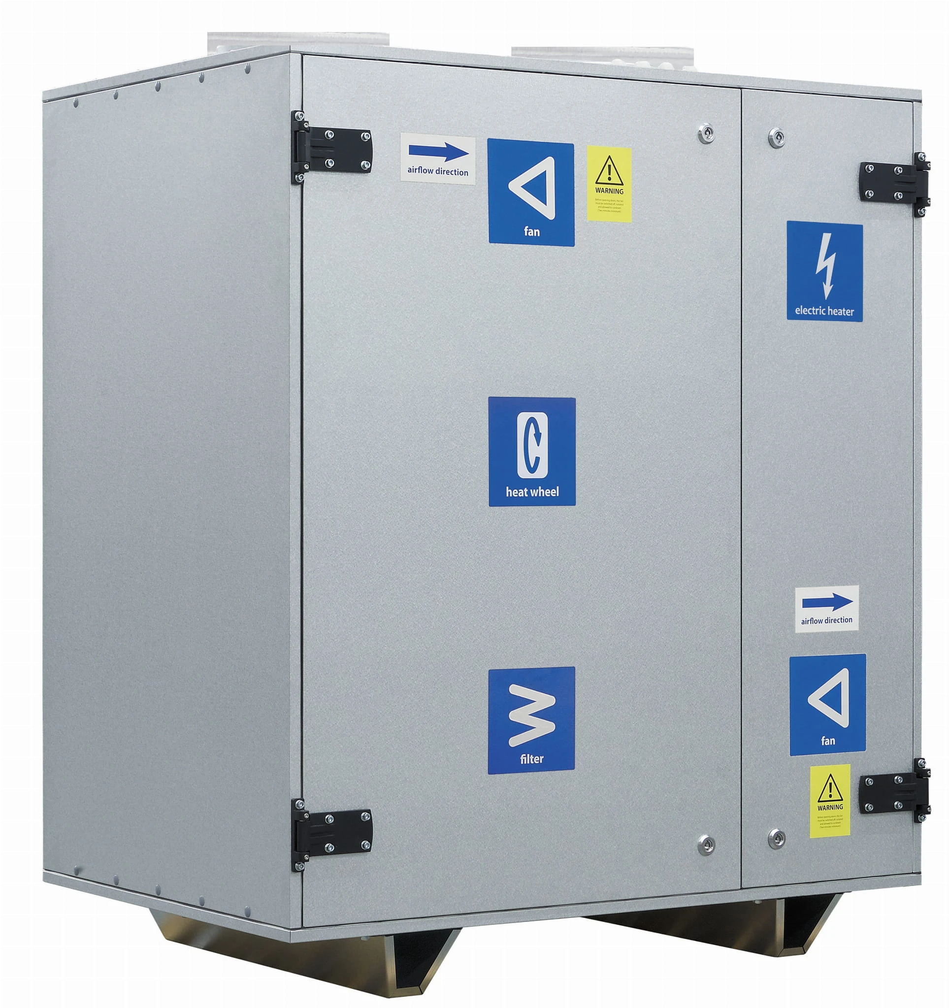 Centrala wentylacyjna z wymiennikiem obrotowym, stojąca z króćcami do góry, z nagrzewnicą elektryczną, strona lewa, silniki EC,