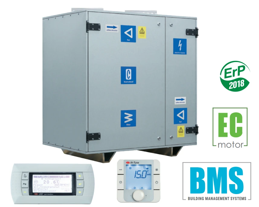 Centrala wentylacyjna z wymiennikiem obrotowym, stojąca z króćcami do góry, z nagrzewnicą elektryczną, strona prawa, silniki EC,