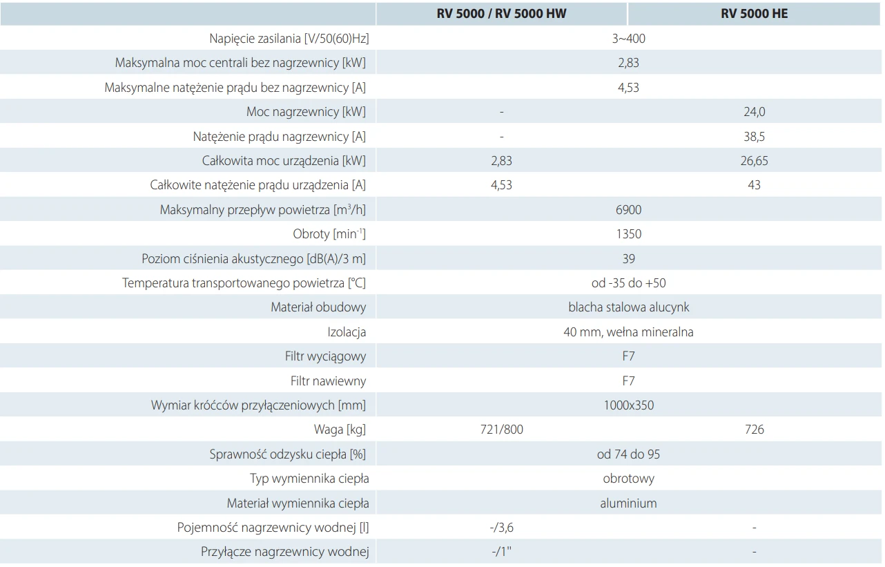 Centrale RV HE są wyposażone w nagrzewnicę elektryczną do dodatkowego podgrzewania nawiewanego powietrza za rekuperatorem. Centrale RV HW są wyposażone w nagrzewnicę wodną do dodatkowego podgrzewania nawiewanego powietrza za rekuperatorem. Centrale RV nie mają wbudowanej nagrzewnicy elektrycznej.