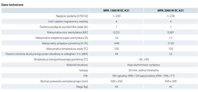 Centrala wentylacyjna nawiewna MPA 1500 W EC A31 - z nagrzewnicą wodną - wymaga dokupienia sterownika A30 lub A32.